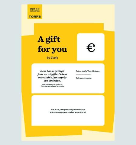 Maak iemand blij met een Torfs cadeaubon – digitaal, snel en altijd een goed idee. Bestel online en ontvang het binnen een uur. Al vanaf €5.