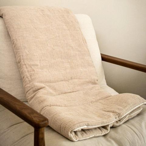 Blanket in a striped muslin on one side and an off wihte on the other with natural piping all around. Production: Made in Portugal OEKO-TEX label
