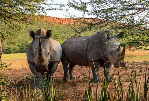 We maken een rondrit door de bushsavanne aan de voet van de Waterberg. We hopen oog in oog te komen staan met neushoorns en met een beetje geluk ontmoeten we ook nog giraffen, oryxen en koedoes.