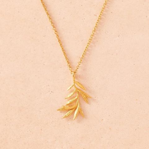 Elaia is a delicate olive branch pendant necklace, softly curved and suspended from a slim chain—a botanical symbol of peace and resilience.