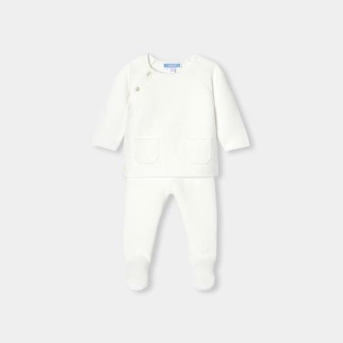 Ensemble naissance bébé- Coton biologique- Maille point mousse- Haut à ouverture devant par boutons en nacre naturelle- Poches plaquées devant- Caleçon à pieds- Taille haute élastiquée
