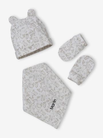 De nombreux animaux sont réunis sur cet adorable ensemble 4 pièces ! Le bonnet à petites oreilles, les moufles et le foulard sont