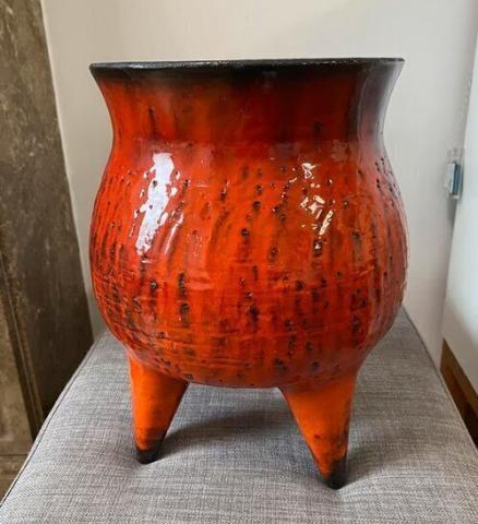 Dikke lava driepootvaas in perfecte staat. Oranje kleur met zwarte integratie. Hoogte 34cm breedte 21cm. Ongeveer 1970.