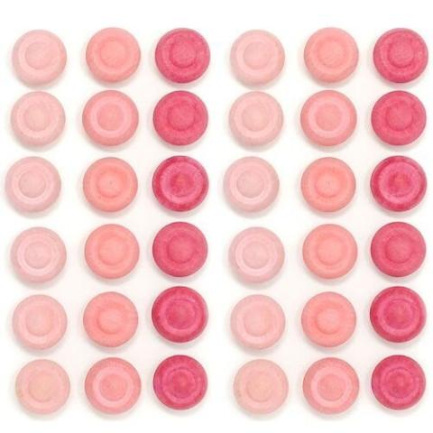 Een set van 36 houten bloemen 'Mandala flors' van het Spaanse merk Grapat in drie tinten roze. De speelvormen zijn in combinatie met ander speelgoed een mooie aanvulling, waarmee allerlei figuren en patronen gemaakt kan worden. Of het wordt gebruikt a