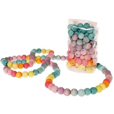 120 houten kralen in zachte pastelkleuren van het Duitse merk Grimm's. Kralen zijn elementair speelgoed voor kinderen. Het rijgen is een nauwkeurig werkje en stimuleert de oog-hand coördinatie en motoriek.