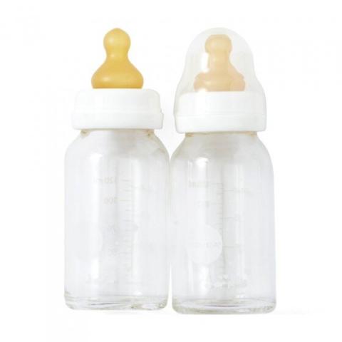 Set van 2 glazen babyflesjes met kersvormige natuurrubberen zuigspeen in maat 0-3 maanden. Niet geschikt voor dikke vloeistoffen. Het beschermkapje...