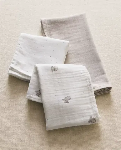 Hydrofiele doeken voor baby's. Gemaakt van katoenen mousseline, twee met een olifantenmotief en de andere in een effen kleur.