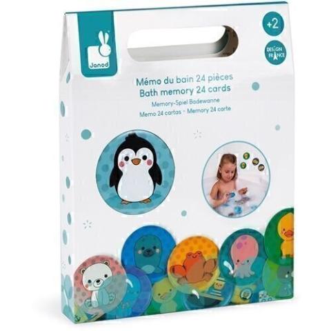 Eindelijk kan memorie ook in bad gespeeld worden met dit waterbestendige memoriespel van het Franse merk Janod. De 24 schuimrubberen memoriekaartjes drijven op het water, maar kunnen net zo makkelijk op de tegelmuur geplakt worden. Vrolijk gekleurd bad