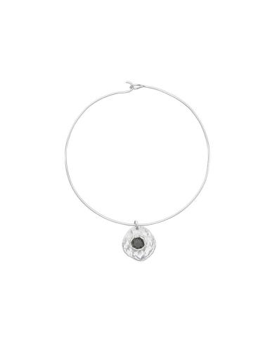 The Kaia Charm Choker features a stunning silver wire necklace and hammered coin with black stone charm. This piece draws inspiration from the full moon.