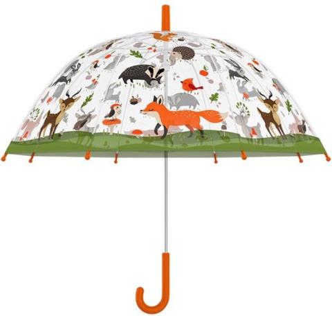 Esschert Design Kinderparaplu transparant bosdieren. Deze kinderparaplu met een bosdierenprint maakt wandelen in de regen één groot feest!