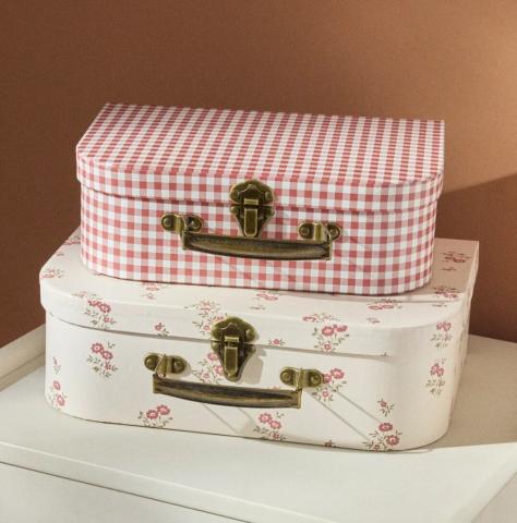 Set van 2 decoratieve (opberg)koffertjes in bedrukt papier, met de hand gelijmd. Het kleinste koffertje is bedekt met een donkerrood vichymotief, het grootste koffertje met onze Bianca bloemenprint.