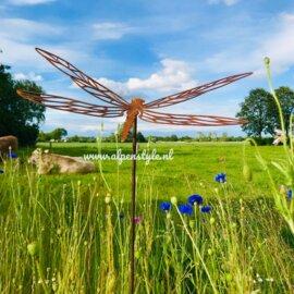 Prachtige libelle tuinsteker met mooie uitgesneden vleugels van groot formaat. Prachtig roest decoratie op het erf, in de tuin tussen de bloemen of aan de rand van de vijver.