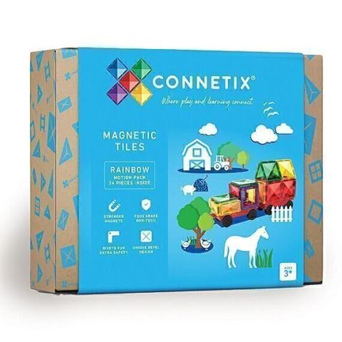 Rainbow Motion Pack van Connetix bevat een Reversibele grijze transportbasis, twee doorzichtige transportbasissen met echte rubberen wielen, plus een reeks magnetische tegels om je eigen speelvoertuigen te maken. De start van grenzeloze creativiteit, plezier en open ended spel.