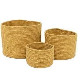 Deze mooie okergele opbergmanden van Nattiot komen altijd van pas in de kinderkamer! De set van 3 verschillende maten opbergmanden zijn gemaakt van een okergeel katoenen touw met daar doorheen geweven gouddraad.
