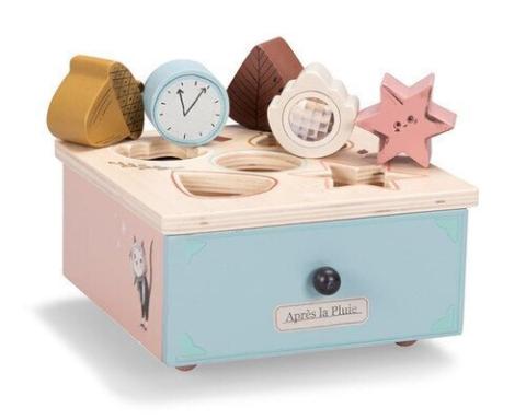 Mooie houten vormenstoof uit de serie 'Après la Pluie' van het Franse kwaliteitsmerk Moulin Roty.De vormenstoof bevat 5 vormen speciaal ontworpen voor kleine handjes. Elk gat is omgeven met een lijn in dezelfde kleur als de bijpassende vorm om je kleintje een beetje op weg te helpen.Open de la om alle stukken er weer makkelijk uit te halen.Afmeting: 8,5 cm x 16,5 cm x 16,5 cm.