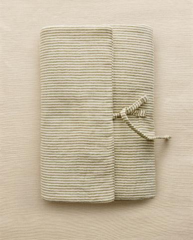 Draagbaar katoenen mousseline verschoonmatje met gestreept motief. Koordsluiting.Het badstoffen gedeelte is afneembaar met knopen voor makkelijke reiniging.