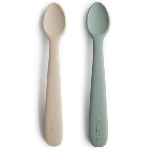 Twee siliconen babylepels 'Baby Spoon - Cambridge Blue, Shifting Sand' van het Amerikaanse merk Mushie om de allerkleinsten mee te voeren. Het siliconen is zacht voor de babymond, ook wanneer de eerste tandjes doorkomen en het tandvlees gevoelig is. Ma