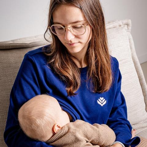 Zacht voor jou, handig voor hem/haar Een fris briesje buiten, een warme kop koffie binnen. Dit navy blue long sleeve t-shirt houdt je comfortabel, wat de dag ook brengt. De ademende stof van 100% organisch katoen voelt zacht aan op je huid en beweegt met je mee. Dankzij de drie subtiele drukknopjes aan elke zijkant gee