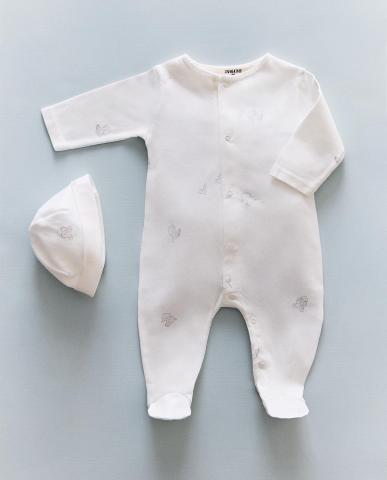 Babyset van katoenen jersey. De set bevat een romper met lange mouwen en knoopsluiting op de voorkant en een muts. Beide hebben een olifantprint.