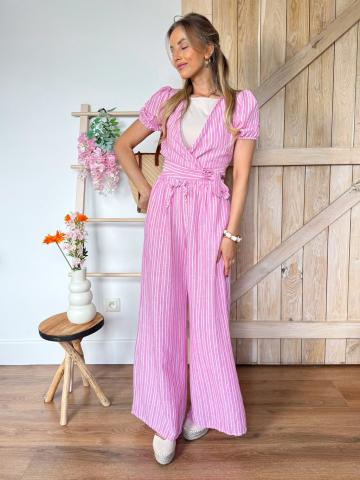 Cutie alert! Deze roze 2-piece set is gemaakt voor sunny days & Insta pics. Het cropped wikkel topje met pofmouwen en V-hals knoop je zelf mooi strak rond je taille. De bijhorende broek heeft een hoge taille en rechte wijde pijpen, gemaakt van superlichte polyester. Pastel vibes + Italiaanse flair = summer slay.