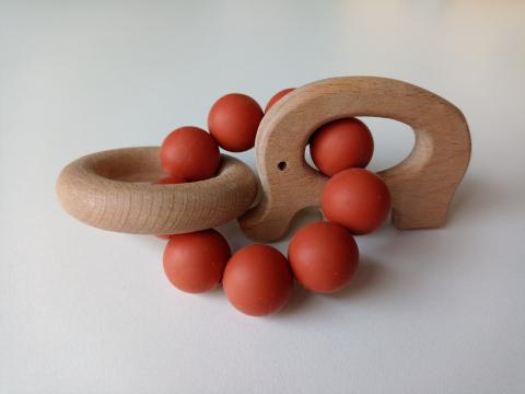 Deze toffe Play Rattle Chewie is makkelijk vast te houden aan de houten ring, de kralen of het figuurtje. De ring & het figuur om de silliconen kralen heen maken een rustgevend rammelend geluid.