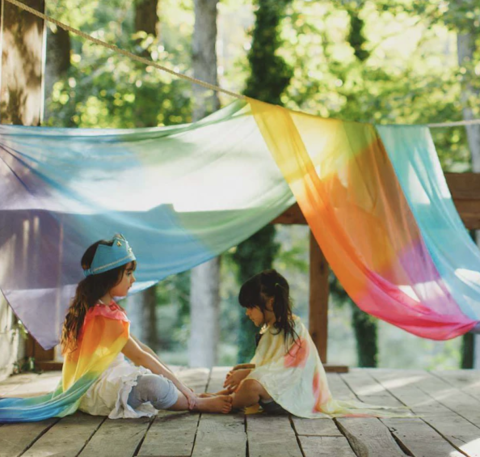 Stella bouwt super graag kampen, alle dekens en doeken in huis komen er aan te pas. Daarom denken we dat ze heel blij zou zijn met deze grote regenboog zijde doek.