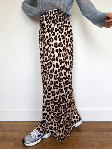 Deze satijnen luipaardprint palazzo broek is een statement piece dat je outfit meteen van saai naar fabulous tilt. Met een hoge elastische tailleband voor extra comfort en wijde, vloeiende pijpen die prachtig meebewegen bij elke stap. De luchtige stof maakt ‘m perfect voor zonnige lentedagen. Combineer met een basic top voor een casual look of met een opvallende blouse voor een gedurfde stijl.