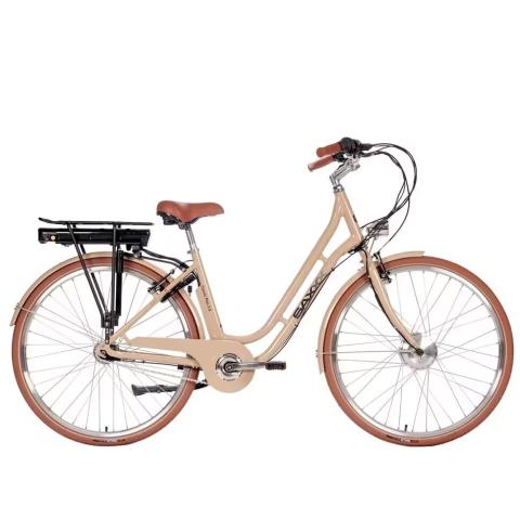Elektrische damesfiets met 7 versnellingen Shimano naaf en voorwielmotor. 11.6 Ah accu op de achterdrager, LED display, 5 ondersteuningsstanden, V-brakes en terugtraprem.