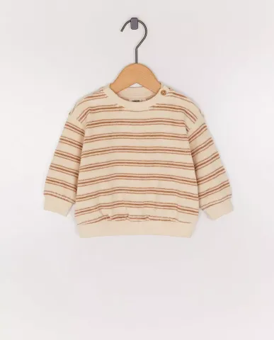 beschikbare maten: 50, 56, 62, 68. Deze gestreepte sweater in badstof voelt heerlijk zacht en comfortabel aan. De drukknopen aan de schouder maken het aankleden vlot en stressvrij. Een speels maar rustig design dat perfect past bij de eerste weken, waarin comfort en knusse momenten centraal staan. artikel: 313814BRM
