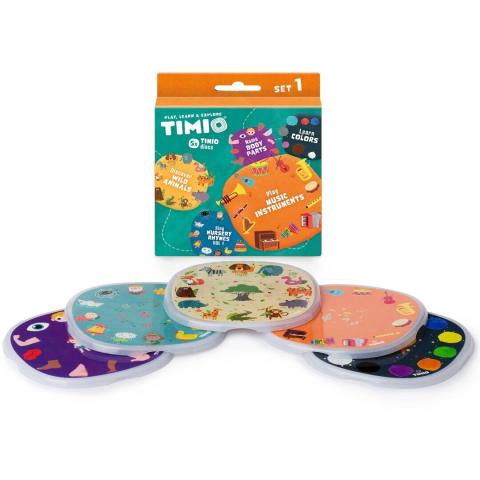 Uitbreidingsset 'Disc Pack Set 1' met vijf magnetische kindercd's voor in de TIMIO audiospeler. Ontdek deze interactieve en educatieve cd's van het merk TIMIO voor jonge kinderen. De cd's hebben een gevarieerd aanbod om kinderen te amuseren of uit te d