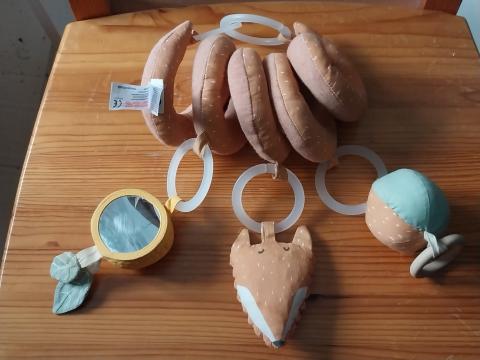 Met veel leuke onderdelen om te ontdekken, tovert deze activiteitenspiraal een lach op elk gezichtje. Hij krult perfect rond de babystoel of speelbox. De drie speeltjes hebben elk hun verrassingen, zoals een houten ring, knisperpapier, een spiegeltje, een belletje en ander leuks om mee te spelen, waar je ook gaat. Alle elementen zijn vastgemaakt met een handige speelring. Je kunt ze dus makkelijk losmaken en apart gebruiken.