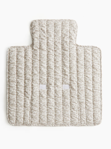 Een gewatteerd, doorgestikt verzorgingskussen van geweven katoen met een geprint dessin. Je kunt het kussen opvouwen en meenemen, zodat je je kleintje onderweg kunt verschonen. Drie vakken voor benodigdheden, waarvan één met een elastische opening. Klittenbandsluiting achteraan. Afmetingen in opgevouwen vorm 16x30 cm.