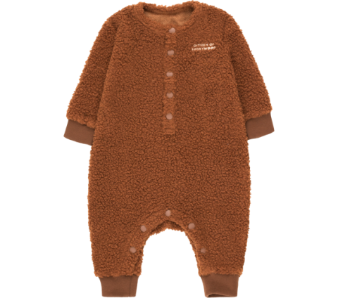 Baby onepiece with long sleeves by Tiny Cottons. In camel brown teddy fleece with small CITIZEN OF LUCKYWOOD embroidery at chest. Featuring long legs, a round neck, tonal ribbings and a pushbutton closure at centre front and between the legs., Baby onepiece with long sleeves by Tiny Cottons. In camel brown teddy fleece with small CITIZEN OF LUCKYWOOD embroidery at chest. Featuring long