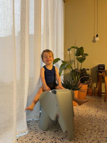 Eames Elephant olifant kinderstoel ijsgrijs van Vitra is ontworpen door Charles Ray Eames - tweedehands gevonden en alvast goedgekeurd door grote broer!