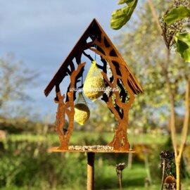 Dit unieke vogelvoederhuis is vervaardigd uit dik staal en is erg zwaar. Bijgeleverd wordt een dikke metalen staaf waarmee je het vogelhuis stevig in de grond kan steken.