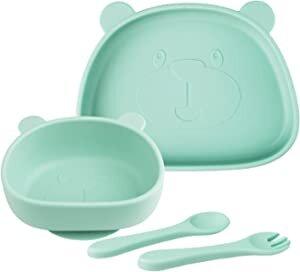 Set Vaisselle pour Bébé Silicone avec Ventouse, 4 Pièces, Set Repas pour Enfants, Inclus Anti-dérapant Assiette, Bol, Cuillère fourche, Compatible Lave-vaisselle, Micro-onde, sans BPA (Cyan) : Amazon.fr: Bébé et Puériculture