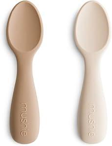 mushie Cuillères d'apprentissage en silicone pour tout-petits, lot de 2 cuillères à manger soi-même, naturel/sable de changement