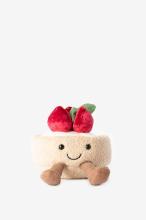 Knuffel in de vorm van een aardbeien taart van het merk JELLYCAT. De knuffel heeft de vorm van een aardbeien taartje met een gezichtje. Afmeting: 11 cm. Materiaal: 100% polyester.