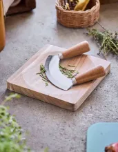 Kruidenhakker en snijplank | Acaciahout/roestvrij staal. 11 x 13 cm/17 x 17 x 1,9 cm.
