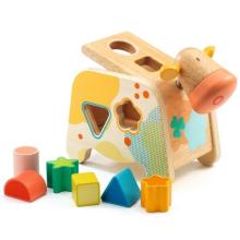 Een houten vormenstoof 'Cachatou' van het Franse merk Djeco. Plaats de zes verschillende houten blokjes in de juiste gaatjes van het koeienlijf, open het klepje en begin opnieuw! Vrolijk peuterspeelgoed dat de motoriek en het vermogen om vormen te onde