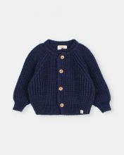 Soft knitted cardigan. Round neck. Front wood buttons fastening. Ribbed cuffs and hem. Tab label detail on hem.