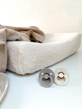 Comfortabele naturel teddy aankleedkussenhoes, OEKO-Tex gecertificeerd en perfect passend voor standaard kussens. Zacht voor de babyhuid, duurzaam bij Heppiejoe.