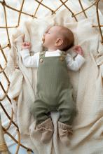 Zacht olijfgroen tuinbroekje voor baby's van Heppiejoe. Met houten knoopjes en drukkers – ideaal geboortepakje of tuinpakje voor jongens!