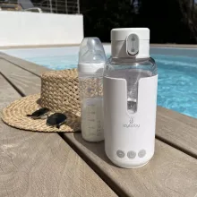 Portable & sans fil le chauffe biberon Nomad. Compatible avec le lait maternel, l’eau ou le lait infantile. Autonomie de 6h. Réglage de la température à partir de 37°C. Conserve la totalité des qualités nutritives du lait.