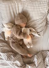 Dit gebreide boxpakje is gemaakt van 100% biologisch katoen en voelt heerlijk zacht aan op de gevoelige babyhuid. De ribstructuur geeft het pakje een warme, rustige uitstraling en zorgt tegelijk voor lichte stretch, zodat je baby comfortabel kan bewegen. Het boxpakje heeft een overslagmodel met striksluiting, waardoor