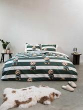 Een groen-beige gestreept dekbedovertrek, met labradoodles in matching trui erop. Een SNURK print waarvan je niet eerder besefte dat je âm echt nodig had. Labradoe mij er zo eentje! Dekbedovertrek met een groen/beige streeppatroon & labradoodle print. Gemaakt in Portugal van 100% biologisch katoen.