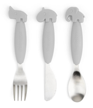 De Done by Deer Friends Easy-grip bestekset met lepel, vork en mes zorgt voor een stevige grip en helpt kleine eters gefocust te blijven op de taak die ze moeten uitvoeren. Om zelfstandig leren eten leuk te maken, is het hebben van de juiste hulpmiddelen essentieel. Het schattige bestek heeft zachte siliconen antisliphandvatten en wordt al snel een favoriet setje. Het formaat van de kinderbestekset is perfect voor een onafhankelijke peuter die leert zichzelf te voeden. Het grijze Ozzo-mes, Nozo-vork en Elphee-lepel passen bij de gehele Done by Deer serviescollectie.