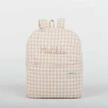 Very light and padded backpack for daycare. Exterior pocket with zipper. Interior in organic cotton lining with Minicoton logo. Adjustable handles in 2 positions with automatic clasps. Front strap to attach a Charm. Top strap for hanger. Embroidered item available in stock and for immediate delivery: “Cayetana” embroid