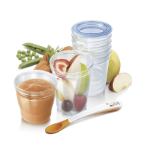 De Avent Hapjesset Via Natural met 20 bewaarbekers is perfect voor het bewaren van moedermelk en babyvoeding, geschikt voor diepvries, magnetron, en vaatwasser.