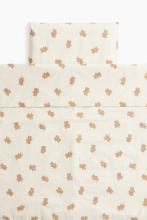Een dekbedset van geweven katoen met een all-over dessin voor een babybed. Het dekbedovertrek heeft een blinde drukknoopsluiting onderaan. De kussensloop heeft een opening met een overslag.